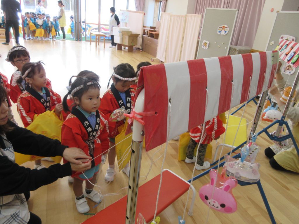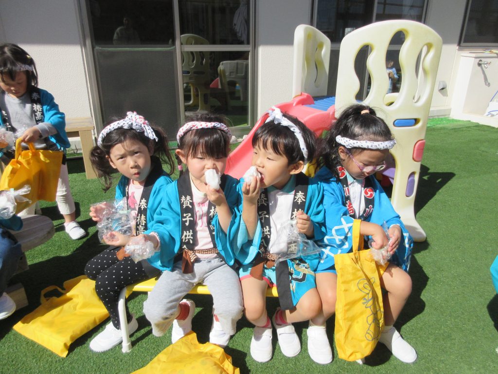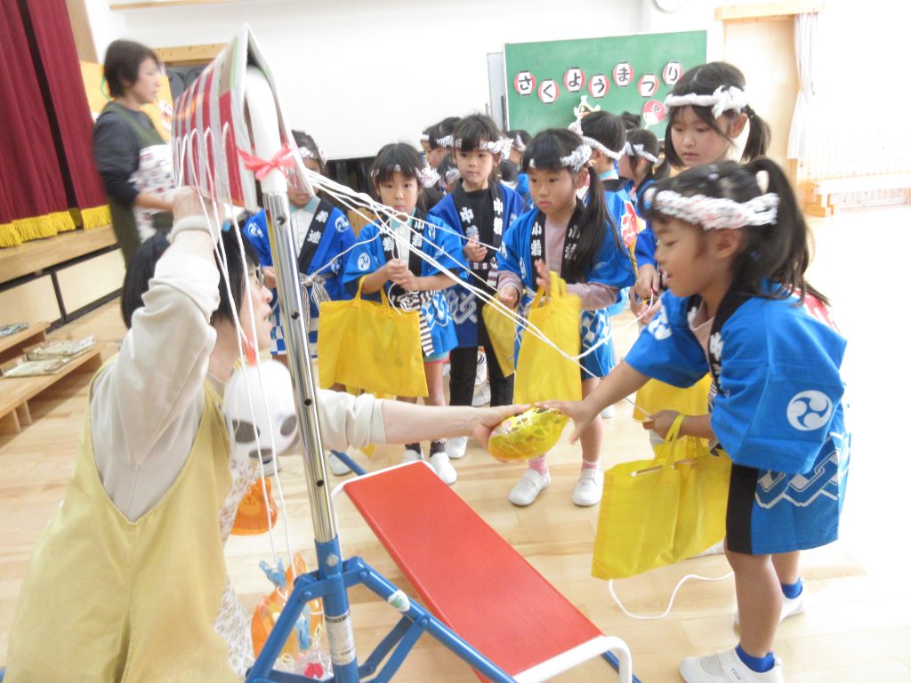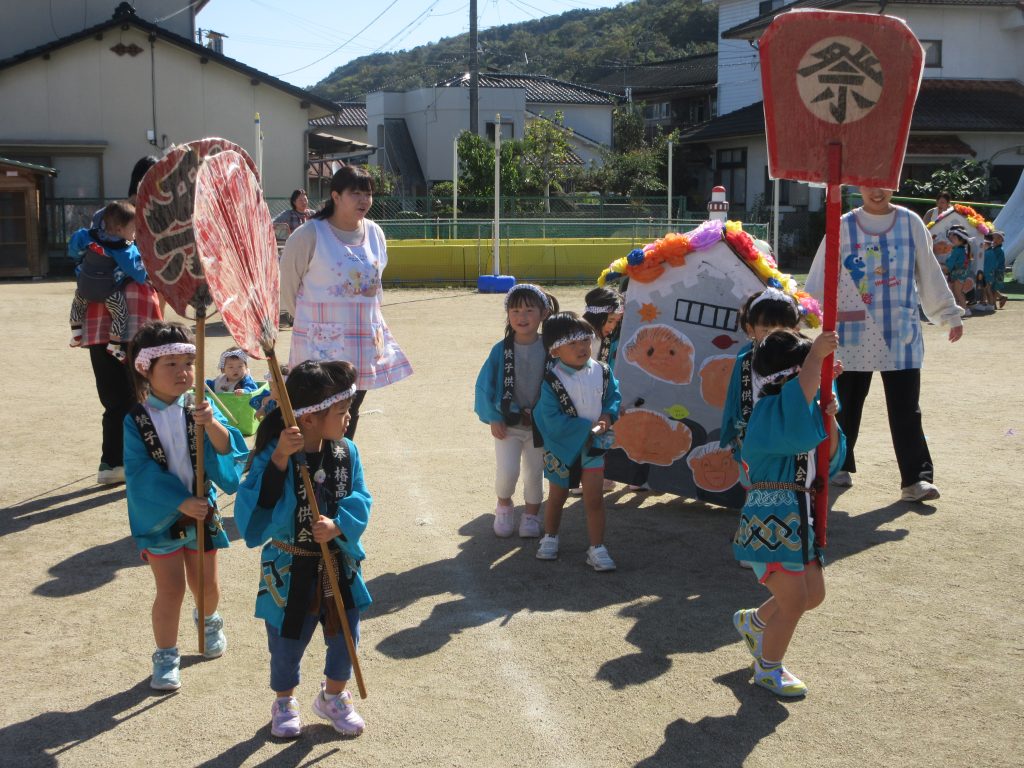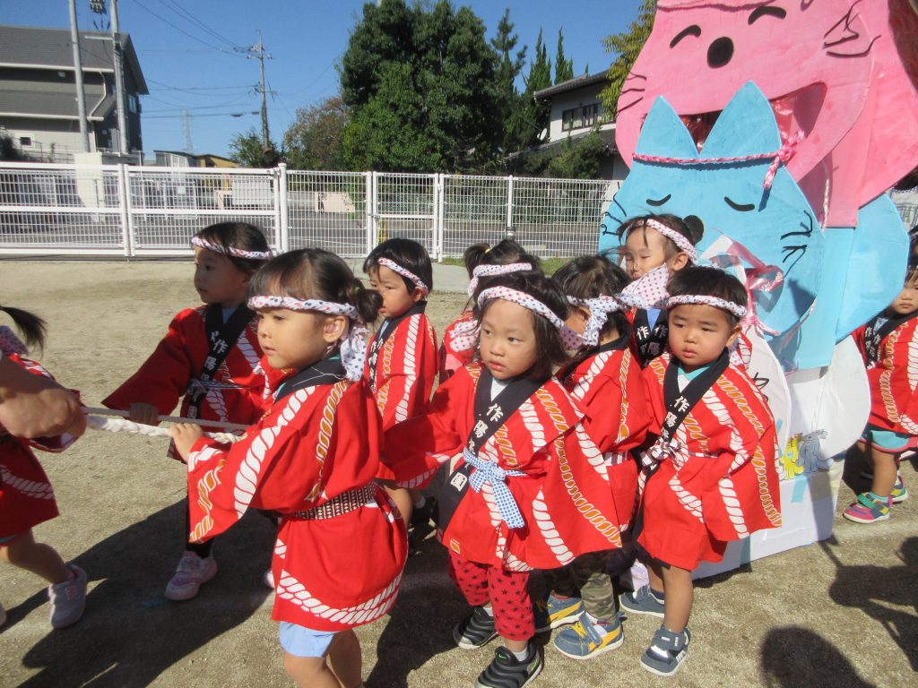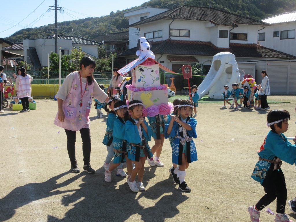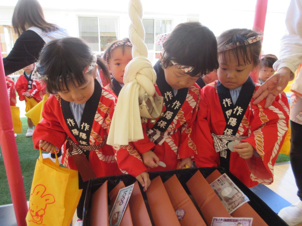 津山市内のお祭りもにぎやかに行われていますが、作陽保育園でも友だち全員でお祭りごっこを行いました。          神輿やだんじりで運動場を練り歩いたあと、さくよう神社にお参りし、くじ引きやゲームをしてお祭りを楽しみました。最後には綿菓子やポップコーンをおやつでいただきました。