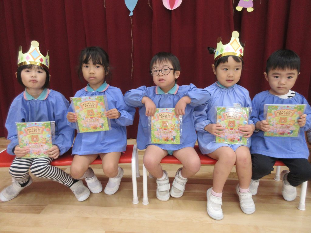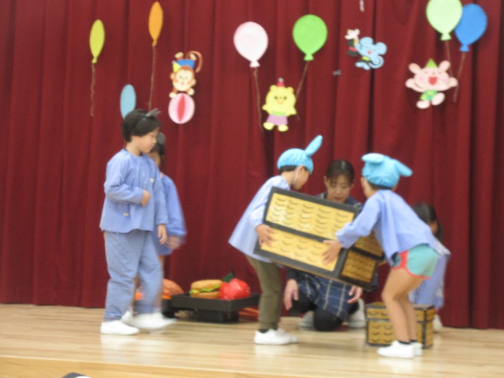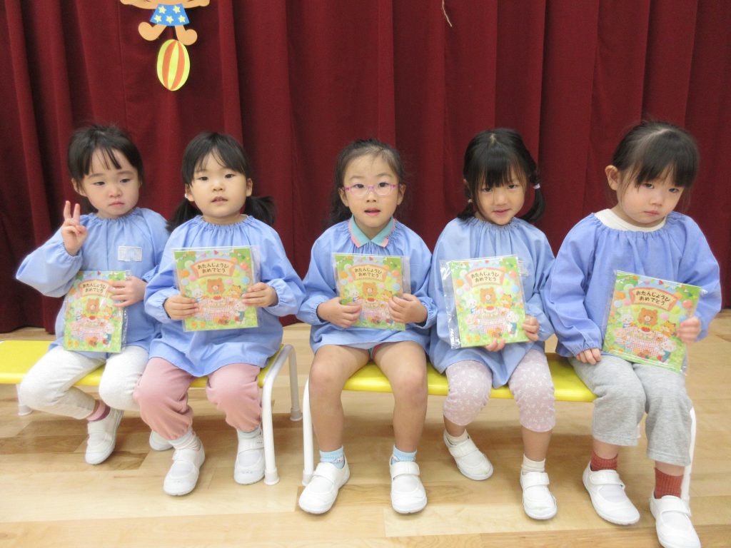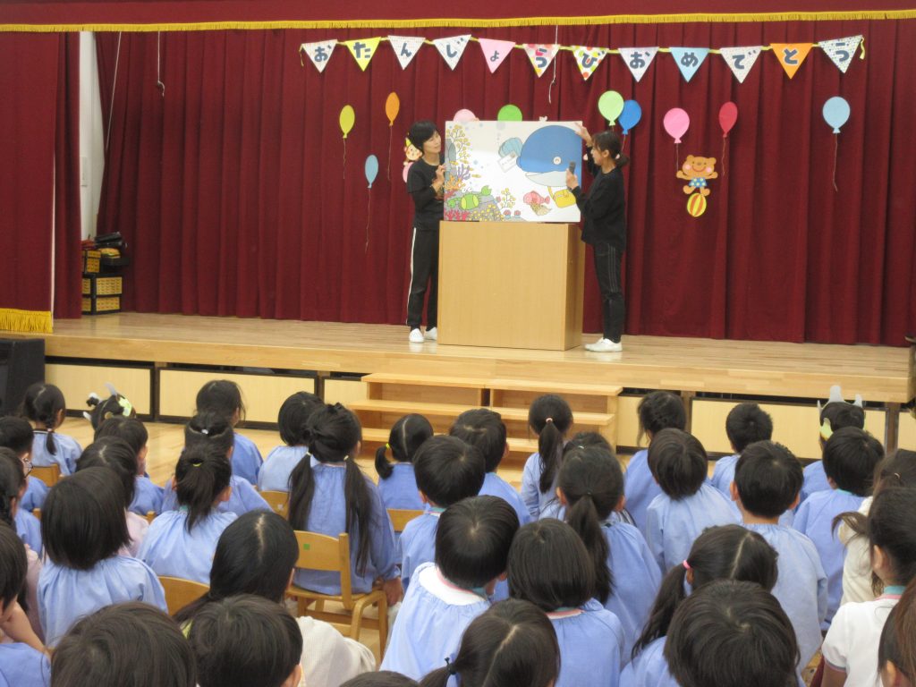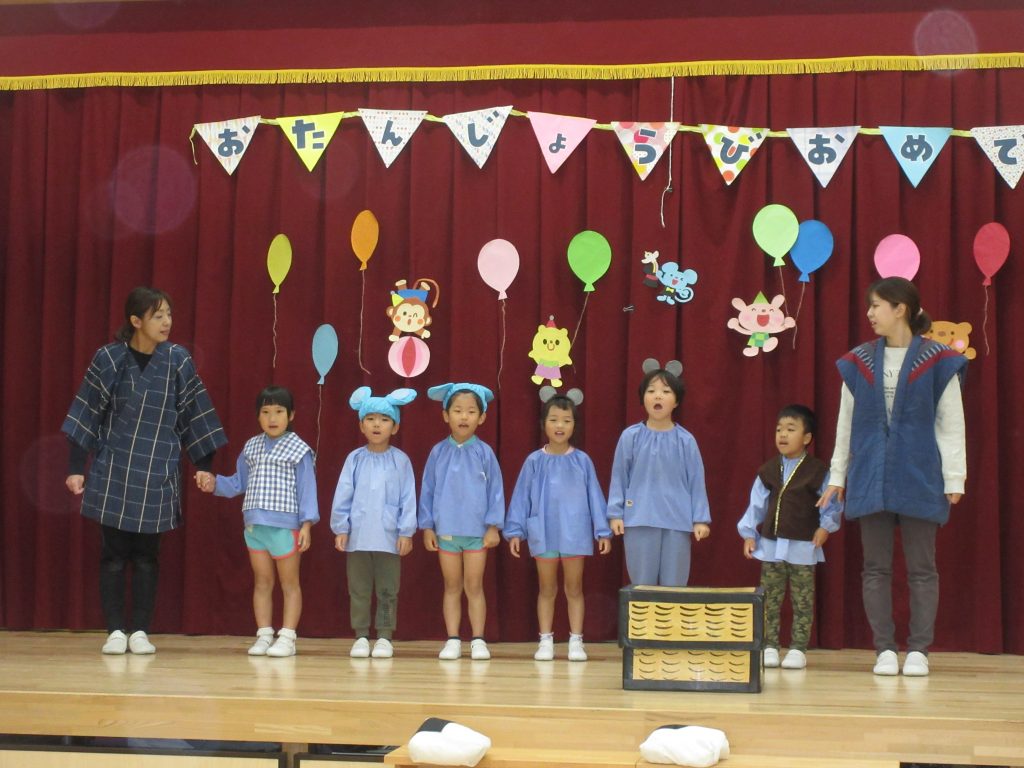 11月生まれのお友達の誕生日をみんなでお祝いしました。 お祝いカードを渡したあと、保育士による大型絵本や手品を楽しんだり、歌を歌ってお祝いしました。最後に白組さんと保育士による劇「おむすびころりん」を楽しみました。