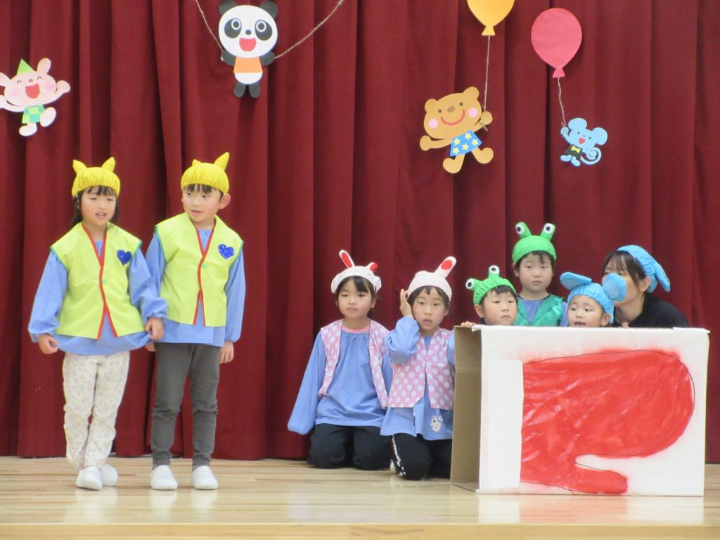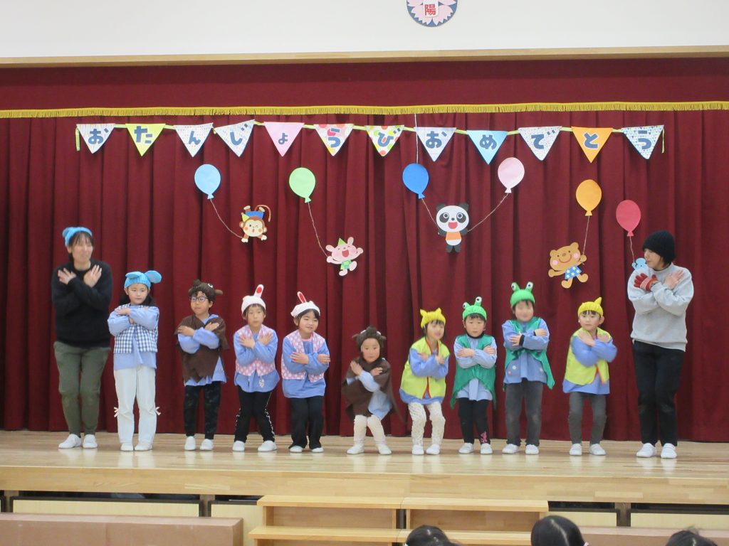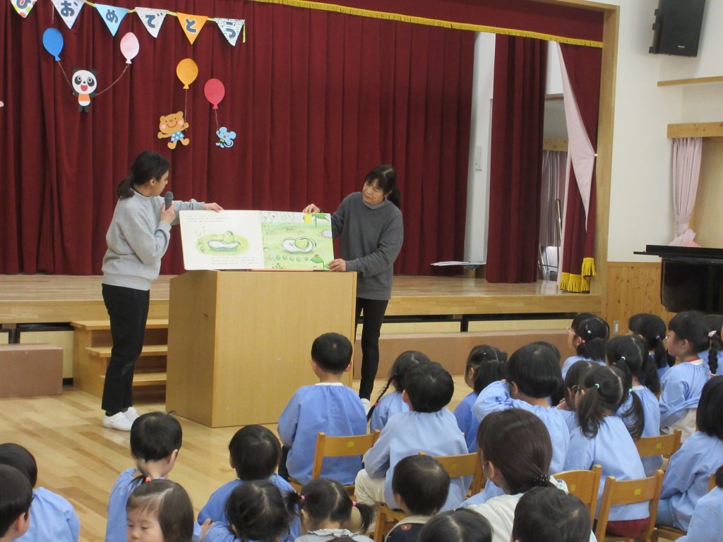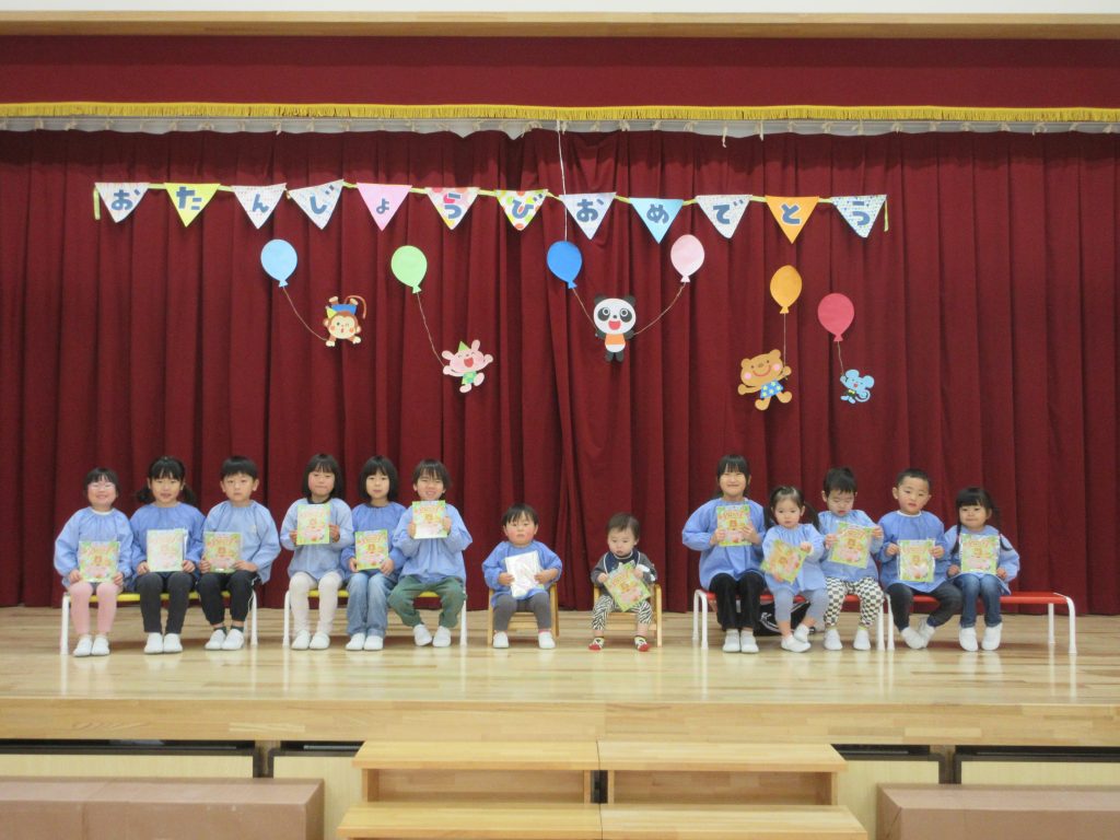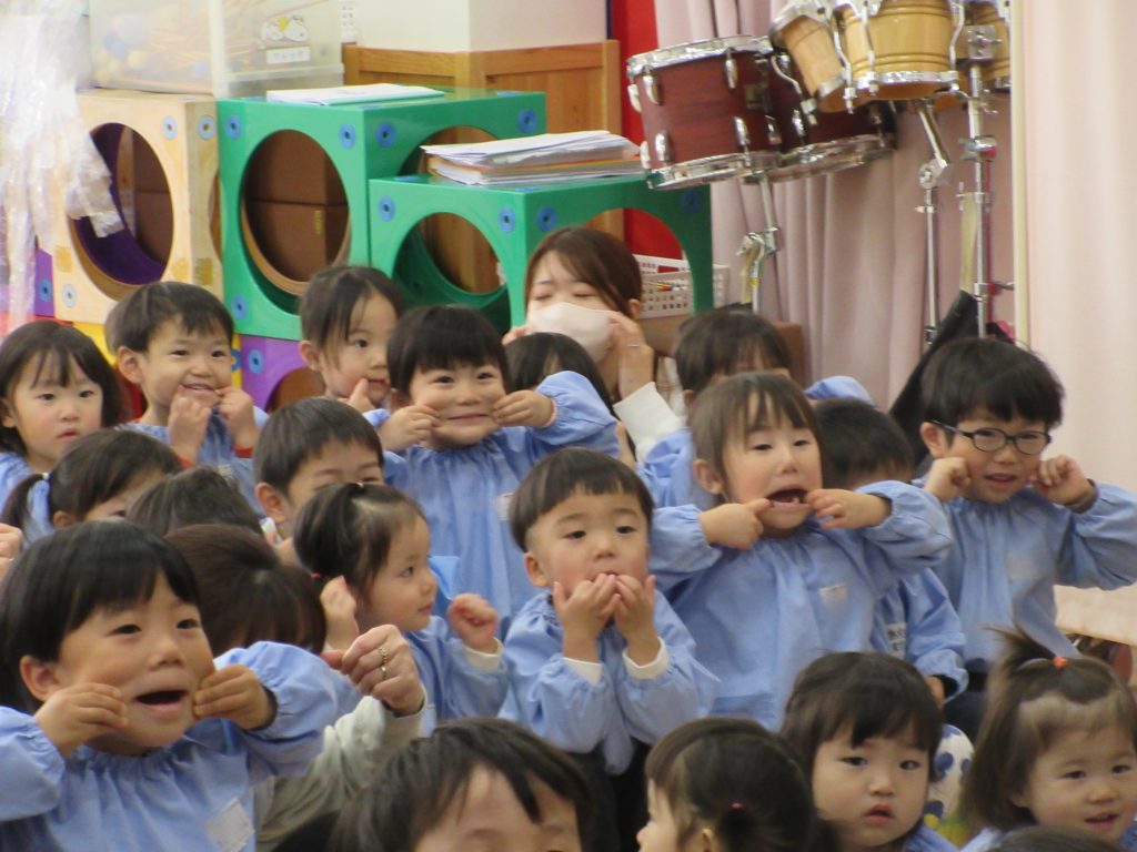 1月生まれのお友だちの誕生日をみんなでお祝いしました。 1月生まれのお友だちに誕生カード渡した後、保育者による大型絵本や手遊び見たり、みんなで歌を歌ってお祝いしました。最後に白組さんと保育者による「てぶくろ地蔵」を楽しみました。